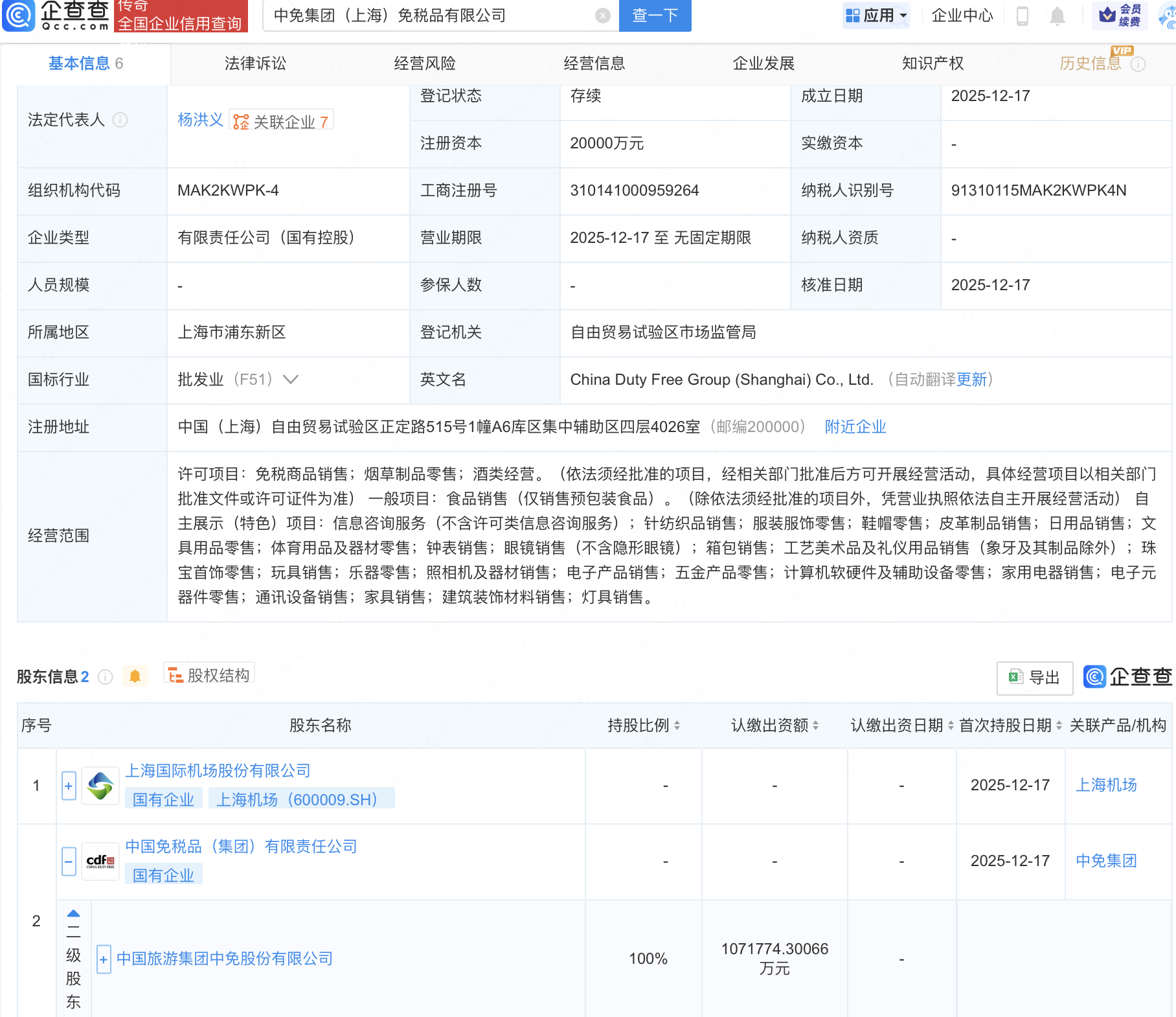 近日,中免集团(上海)免税品有限公司成立,注册资本2亿元,经营范围包含:免税商品销售;烟草制品零售;酒类经营;皮革制品销售等。企查查股权穿透显示易倍策略,该公司由上海机场(600009)、中国中免(601888)全资子公司中国免税品(集团)有限责任公司共同持股。